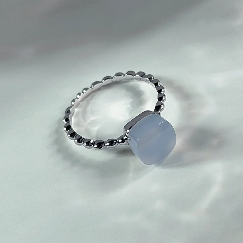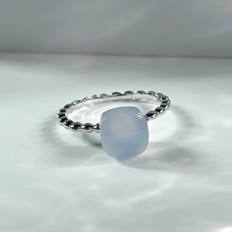 A cushion-shaped cabochon of natural Blue Chalcedony, softly polished to reveal its serene, cloud-like glow.