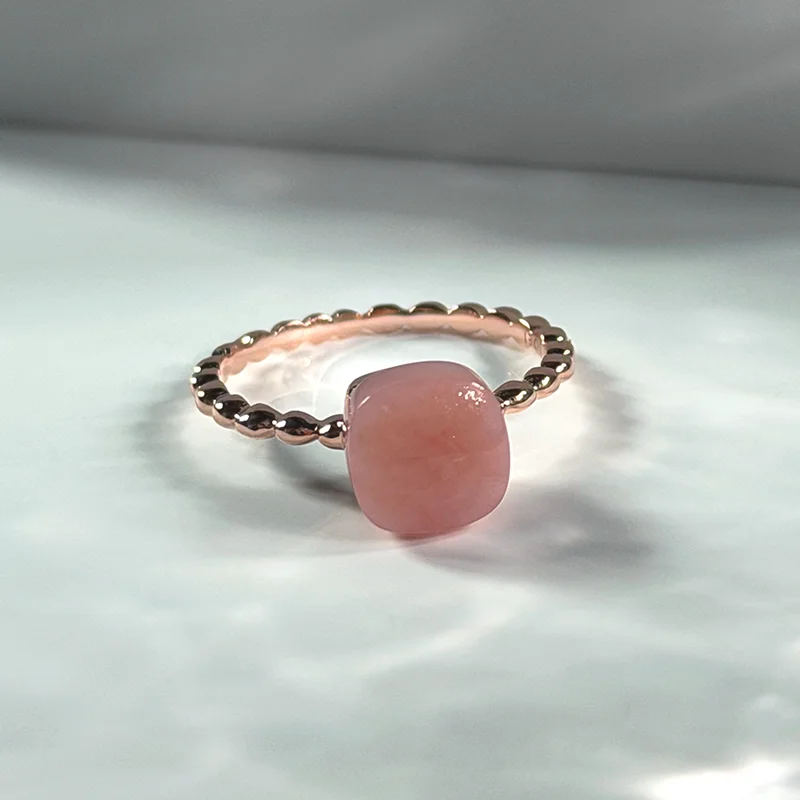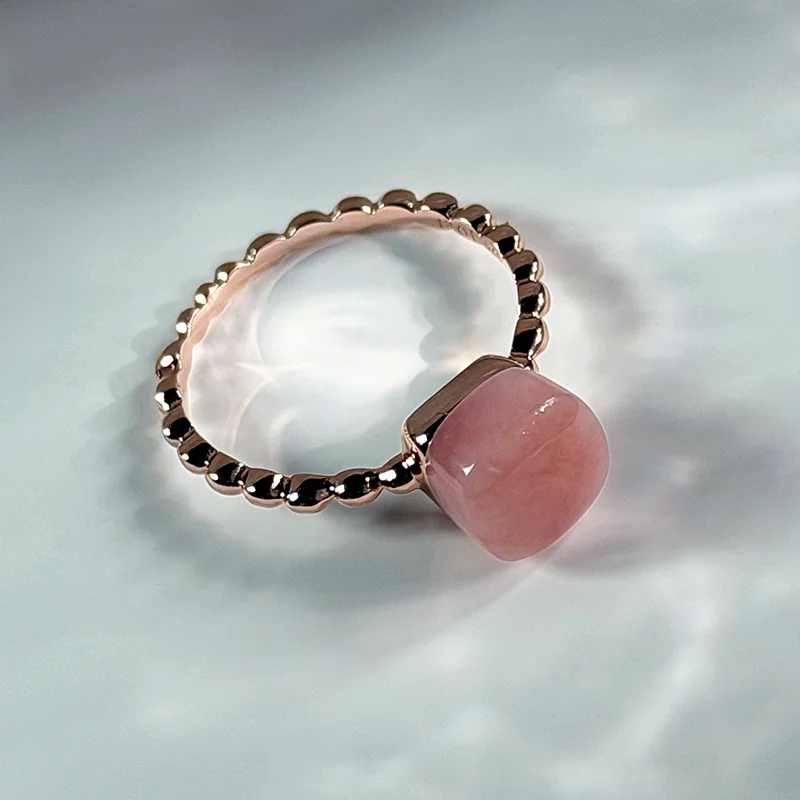 A cushion-shaped cabochon of natural Pink Opal, softly polished to reveal its gentle, blush-toned glow.