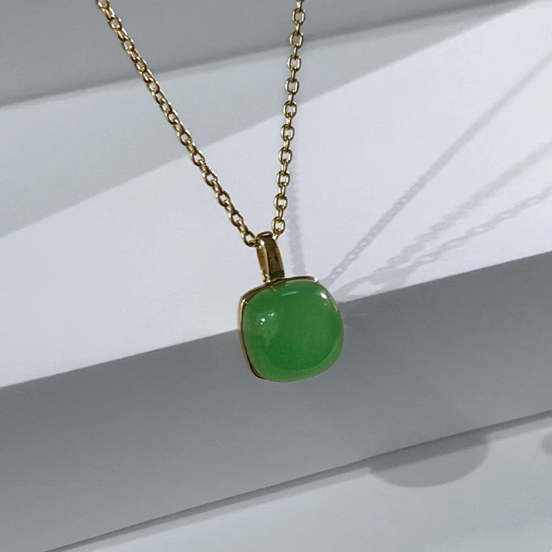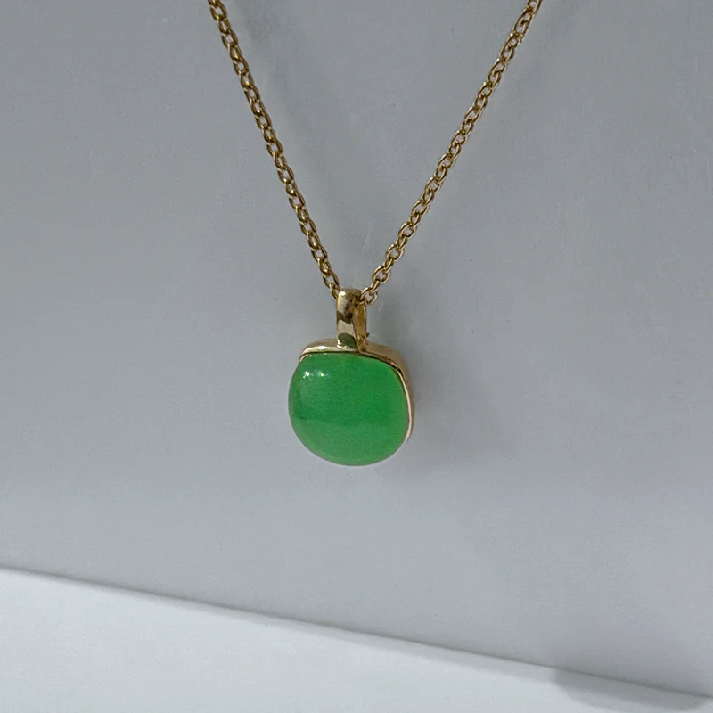 A cushion-cut green chalcedony framed in a smooth gold bezel, suspended on a fine chain.
