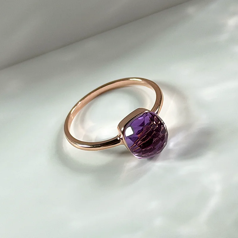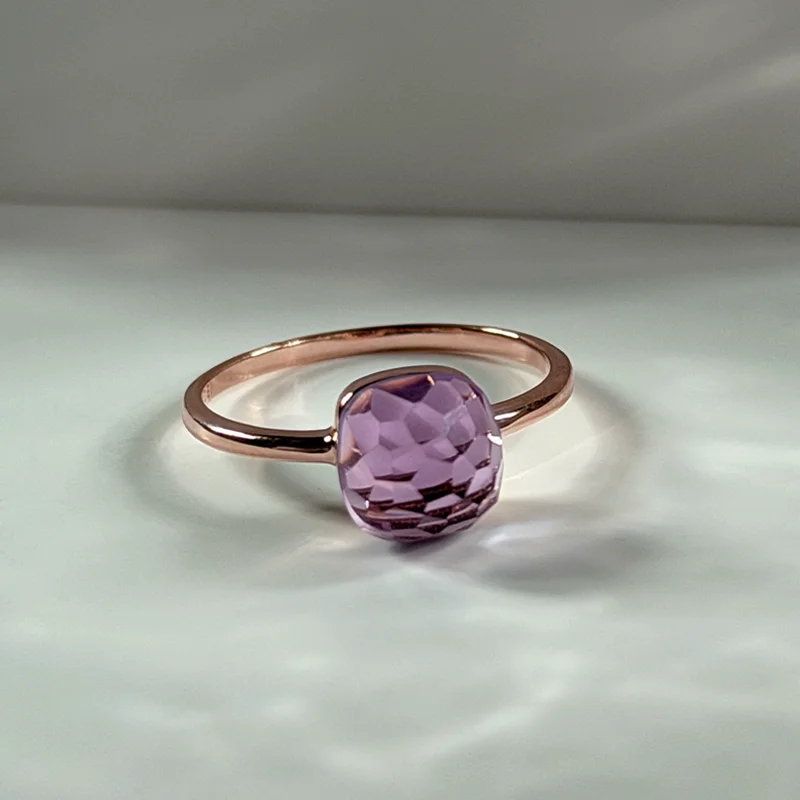 A softly sculpted dome in natural Amethyst, shaped in a checkerboard cushion cut that reveals its deep violet clarity.