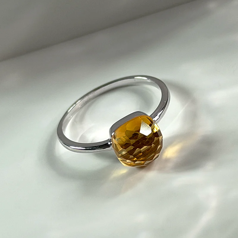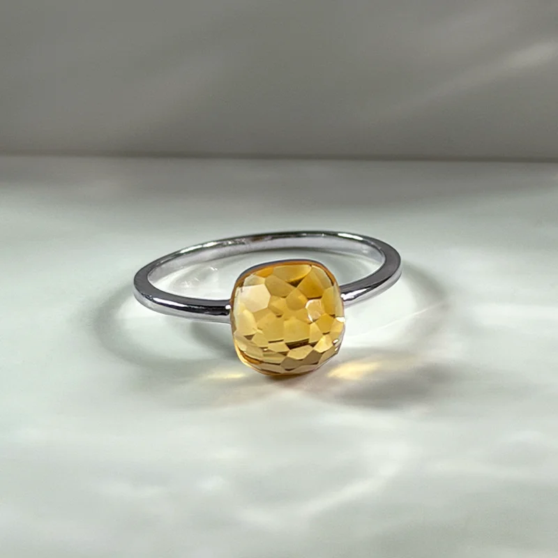 A softly sculpted dome in natural Citrine, shaped in a checkerboard cushion cut that captures its golden, honeyed glow.
