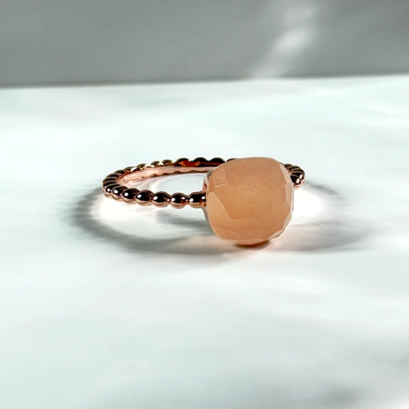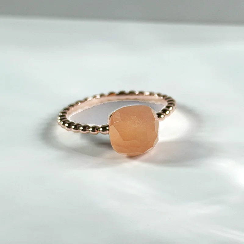 A softly sculpted dome in natural Orange Moonstone, shaped in a checkerboard cushion cut that unveils its warm, sunlit glow.