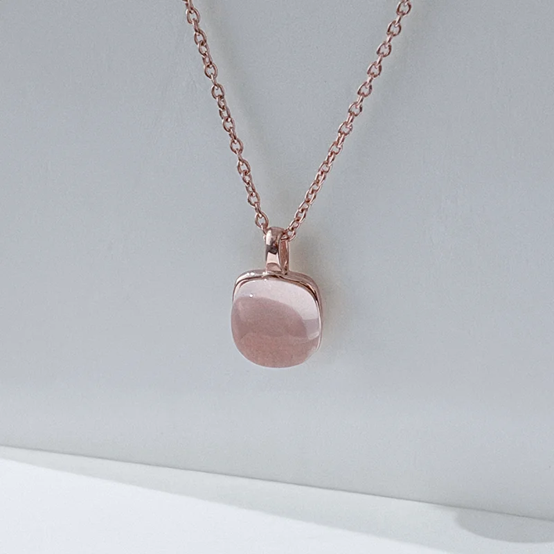 A cushion-cut rose quartz framed in a smooth pink gold bezel, suspended on a fine chain.