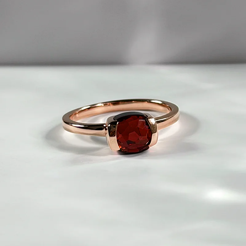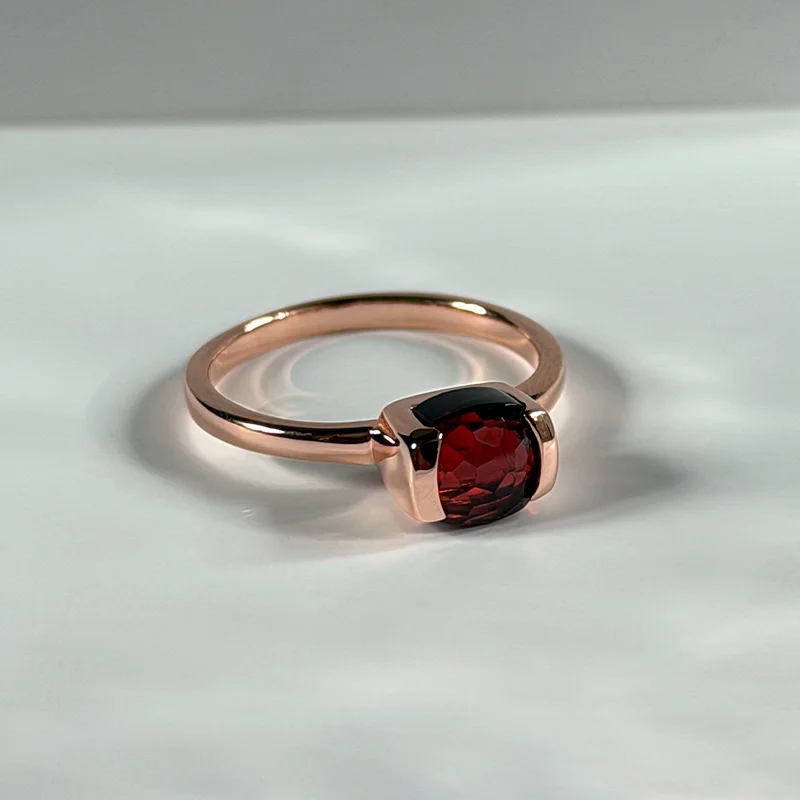 A cushion rose cut garnet set in sculpted gold, revealing deep crimson tones beneath soft facets.