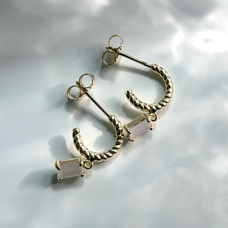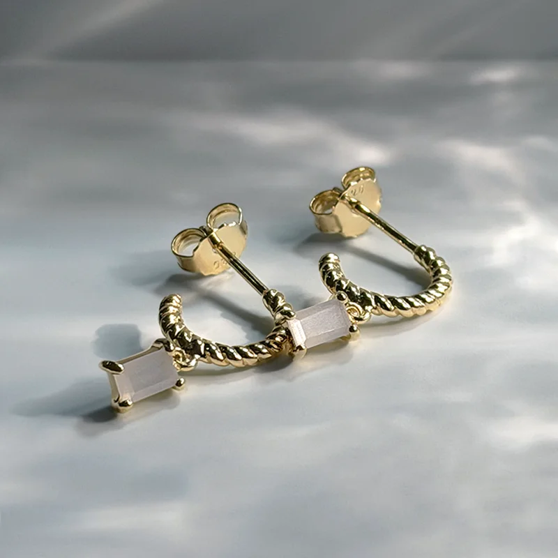 Emerald-cut moonstone suspended from a delicate twisted hoop in 18k warm gold vermeil.