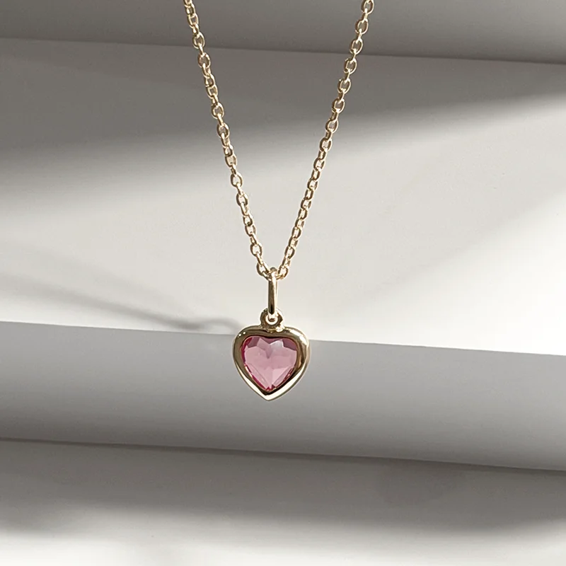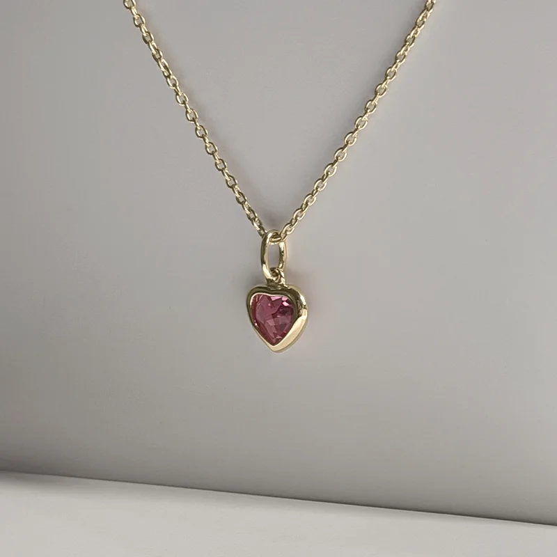 A faceted heart-cut Pink Quartz suspended in warm yellow gold — luminous, feminine, and quietly striking.