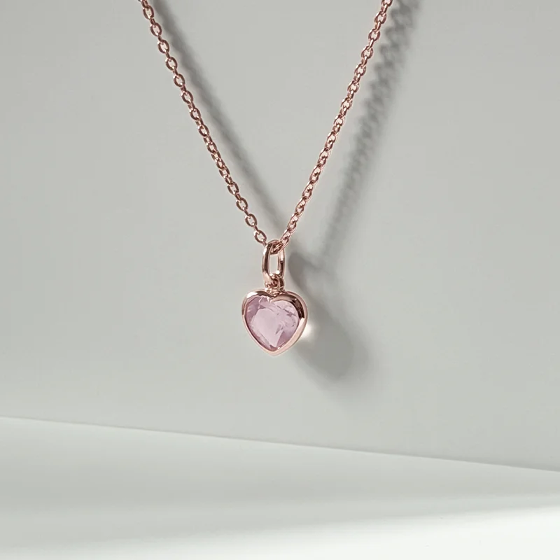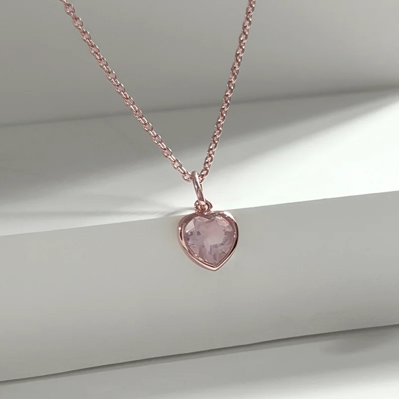 A faceted heart-cut Rose Quartz suspended in warm rose gold — soft, luminous, and effortlessly feminine.