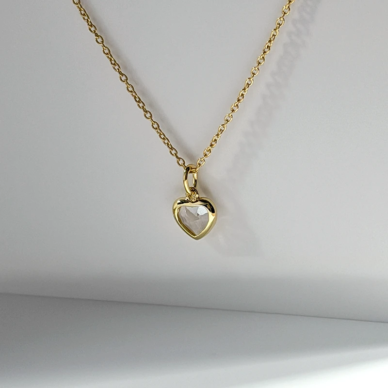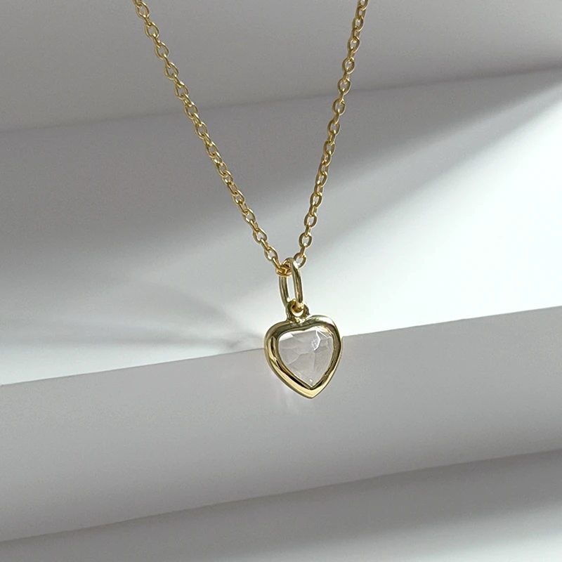 A faceted heart-cut White Topaz suspended in warm yellow gold — crisp, luminous, and quietly radiant.