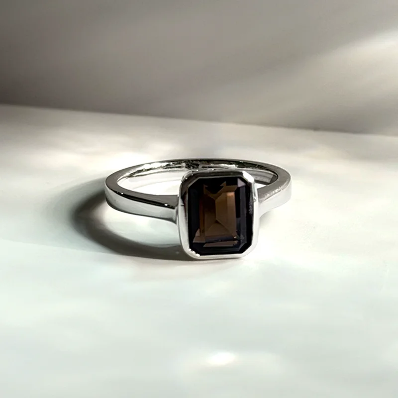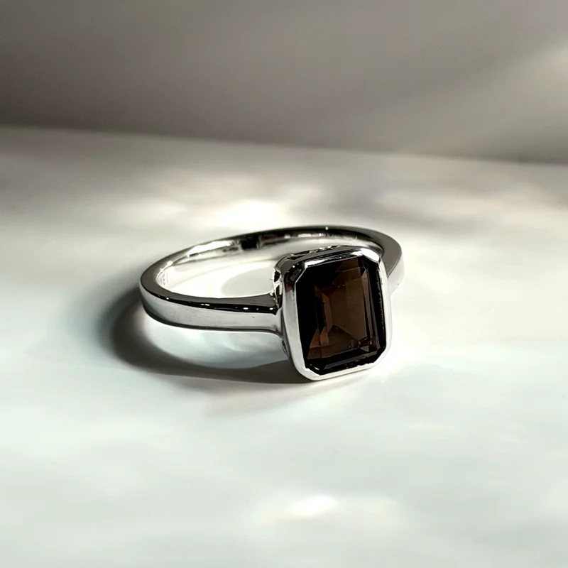 An emerald-cut smoky quartz sits within a sculpted rectangular bezel, revealing layered tones of deep espresso and translucent shadow with every movement.