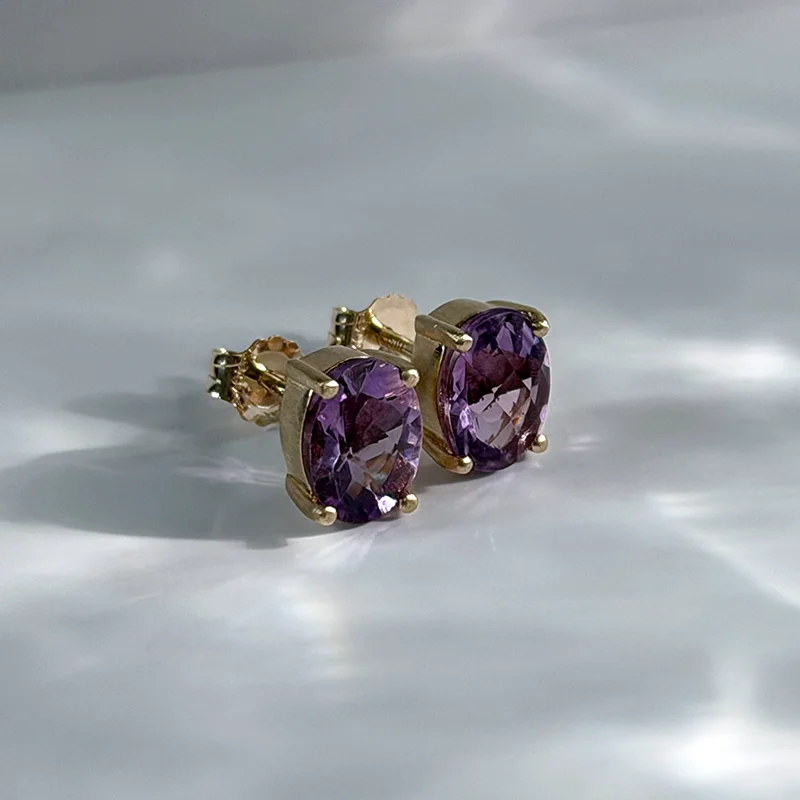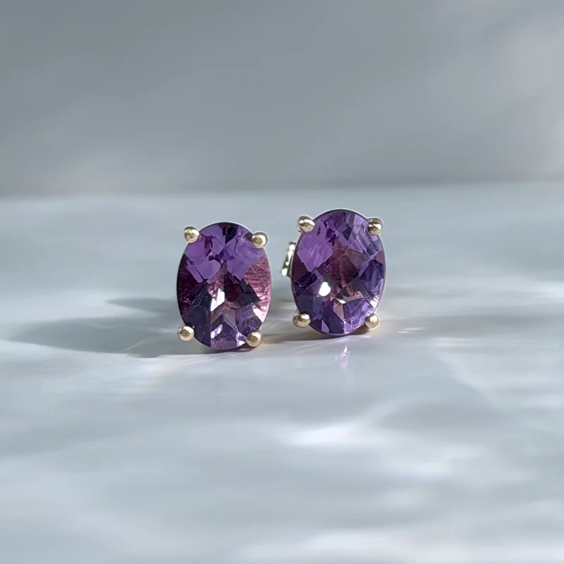 An oval-cut amethyst set in solid 10K gold with a clean four-prong setting.