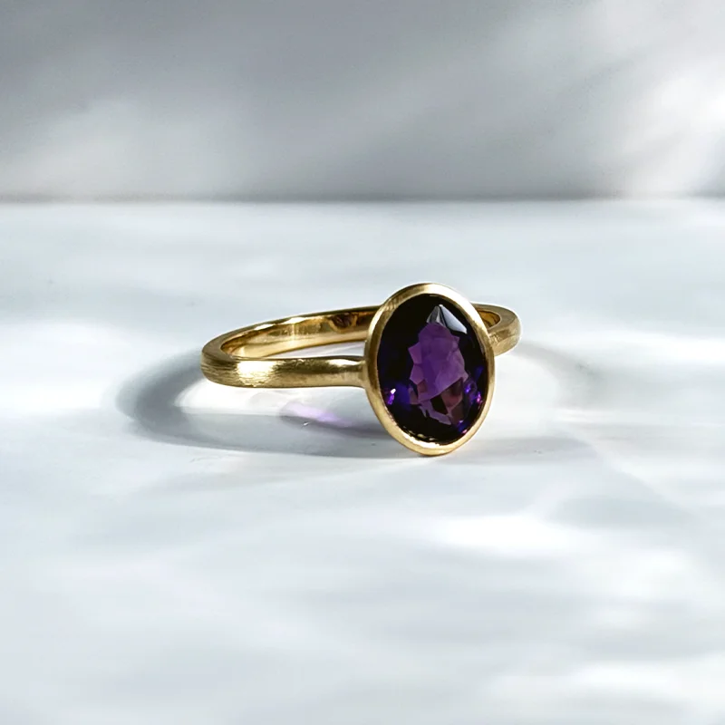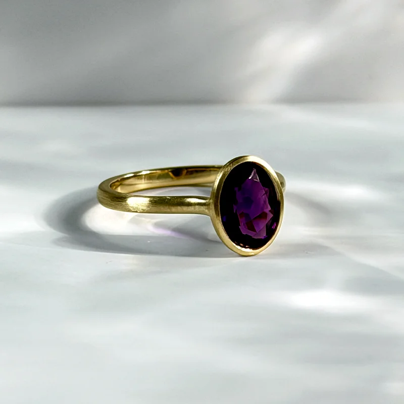 A faceted oval amethyst encased in a smooth, sculpted bezel of solid 10K gold.
