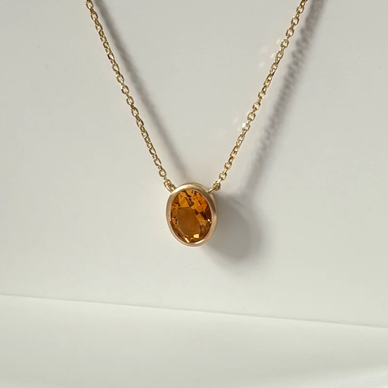 Suspended delicately along the neckline, the honeyed amber tones catch light with quiet radiance — refined, uplifting, and effortlessly composed.