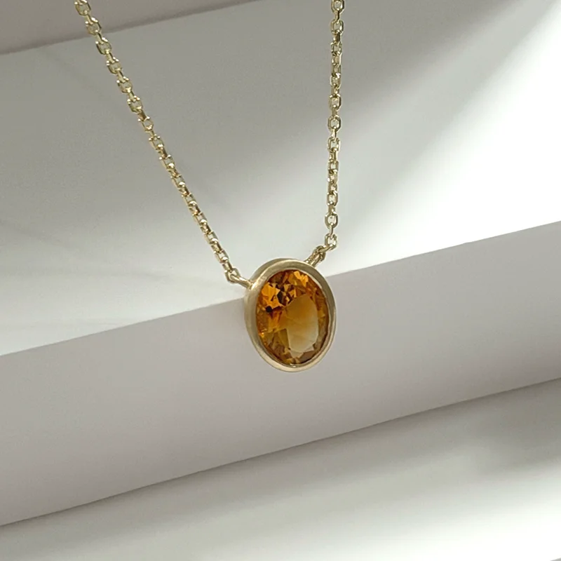A faceted oval citrine glows in soft golden light, set within a smooth, sculpted bezel of solid 10K gold.