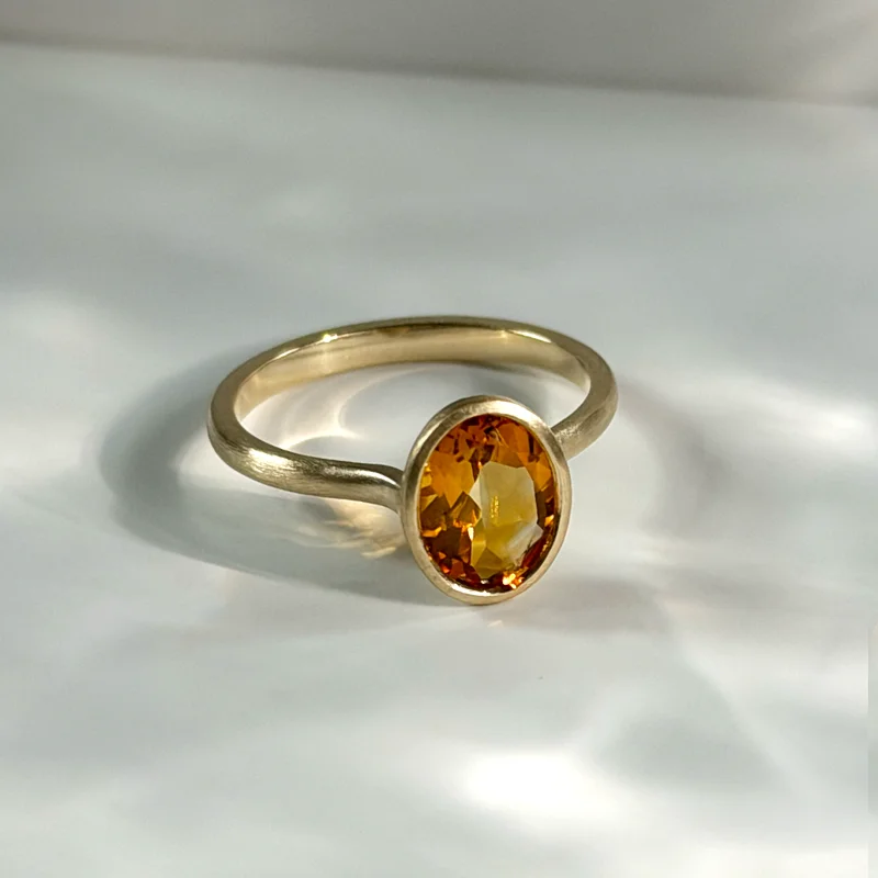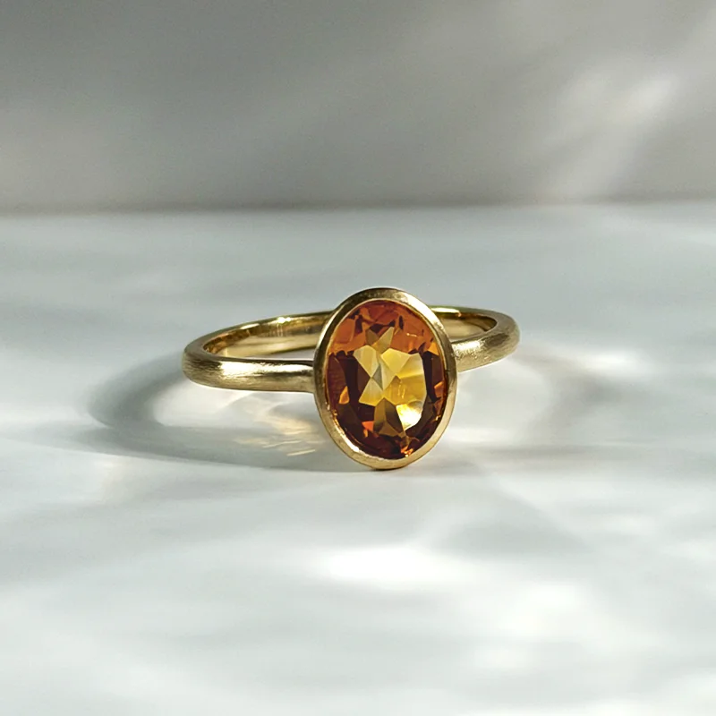 A faceted oval citrine glows in warm golden light, set within a smooth, sculpted bezel of solid 10K gold.