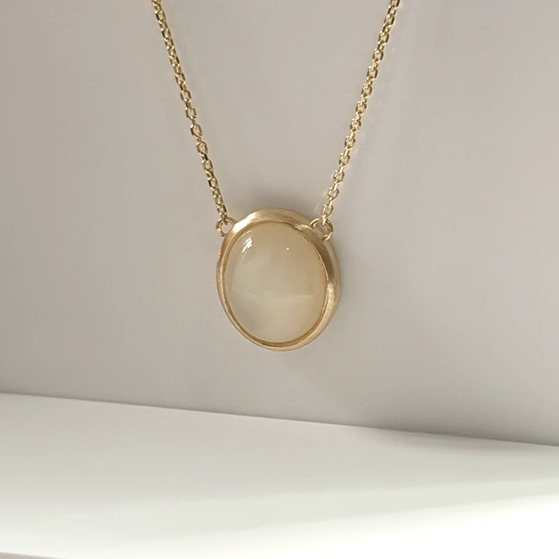 A luminous moonstone set in solid 10K gold, inspired by vintage lines and softened curves.